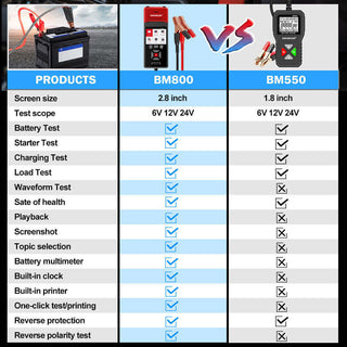 1. 【Powerful Diagnostic Function】BM800 support Battery Test, Startup Test, Charging Test, Load Test, Waveform Test , Battery Life and Power Test, Waveform Monitoring, Waveform Playback, 10 Waveform Record, Screenshots Function, Theme Selection, Battery Multimeter, Built-in Clock, Built-in Printer, Custom info Input, One-click Test, One-click Print, Reverse Polarity Test, Life-time Upgrade.
